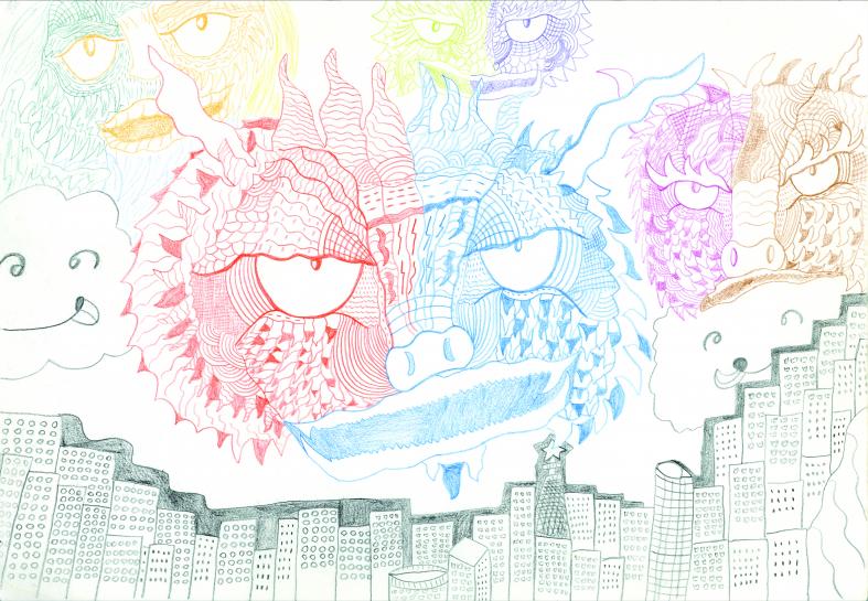 私は毎日の事で絵を描いてると時にスランプになって描けなくなってしまう事もあるが、ならスランプになってる状態で描いてみようと思い描きました。